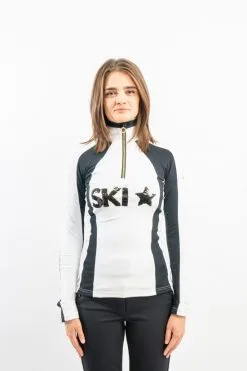 Sottotuta mezza zip in tessuto elasticizzato e traspirante. Impreziosito dagli inserti in tessuto cangiante, dalla zip dorata e dalla applicazione di pailettes reversibili oro/nero. Costruito con tecnologia Silvadur ad azione antibatterica. Vestibilità slim. Morbido e leggero adatto a tutti gli sport all’aria aperta.