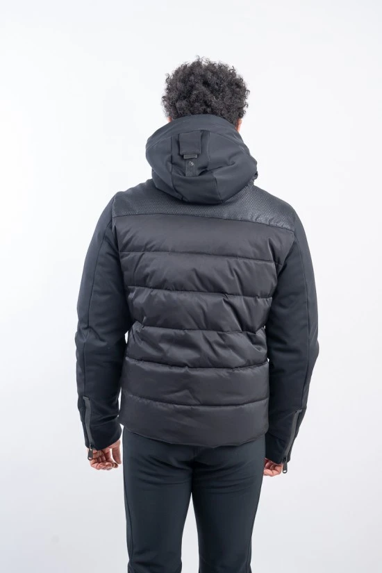 Giacca sci con cappuccio staccabile e regolabile con coulisse. Realizzata in tessuto 4-way stretch ad alte prestazioni con parte posteriore trapuntata. Leggera e calda, imbottita con morbide piume. Fascia sul fondo e polsini elasticizzati. La ghetta interna garantisce una tenuta ottimale.