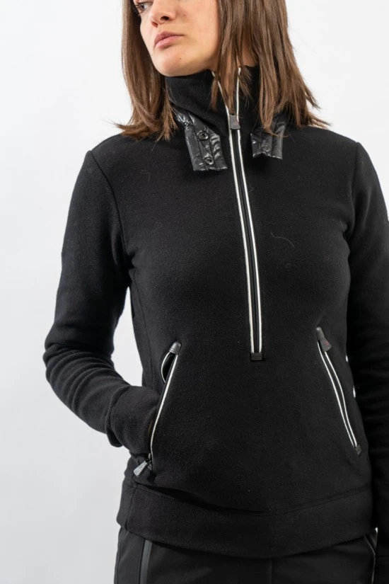 Maglia a collo alto con mezza zip realizzata in pile stretch polar, pensata per offrire calore e protezione sulle piste da sci e nel tempo libero. Antivento e traspirante, impreziosita dai dettagli del collo in nylon laqué e dalle zip waterproof. Vestibilità slim fit.