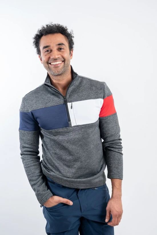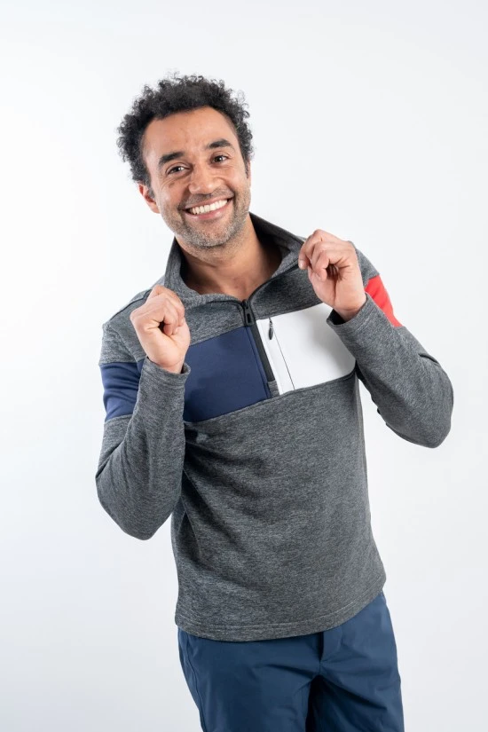 Sottotuta mezza zip in tessuto felpato elasticizzato con cuciture overlock. Inserti in contrasto sulle maniche, sul davanti e sul dietro. Pratico taschino a filo sul petto con chiusura zip. Logo istituzionale cucito sulla manica.