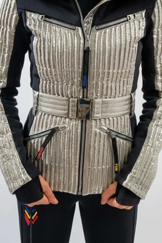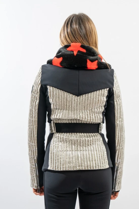 Maddy, ridisegnata per celebrare il ventesimo anniversario di collaborazione con lo stilista Jean-Charles de Castelbajac. L’elegante ampio collo in ecofur stellato, distintivo dello stilista, la caratterizza donandole un tocco di originalità. Il tessuto esterno a coste, d’effetto e brillante, si alterna al tessuto elasticizzato, per consentire la massima libertà di movimento. Imbottita in morbida ovatta è calda ed isolante. La cintura in vita enfatizza la figura, valorizzandola. Confortevole e dotata delle varie opzioni antineve è ideale per passare le giornate sulla neve con stile ed in sicurezza.