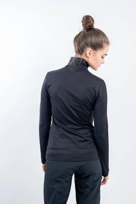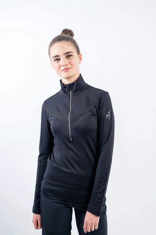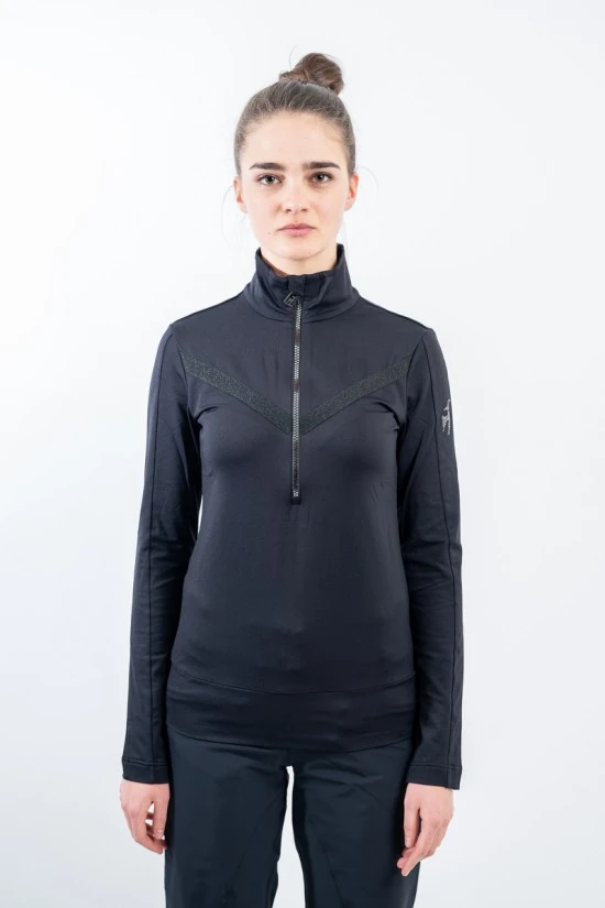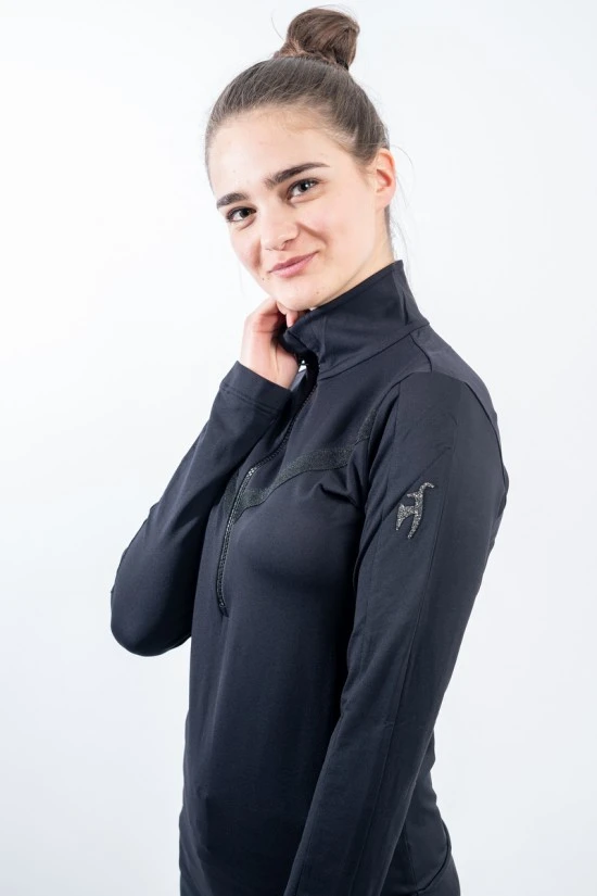 Sottotuta mezza zip in tessuto tecnico elasticizzato e felpato. Arricchito con dettagli in strass e lourex. Pratico e caldo adatto a tutte le condizoni. Logo istituzionale in strass sulla manica.