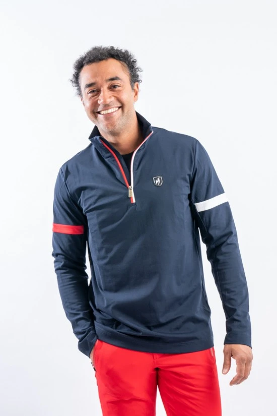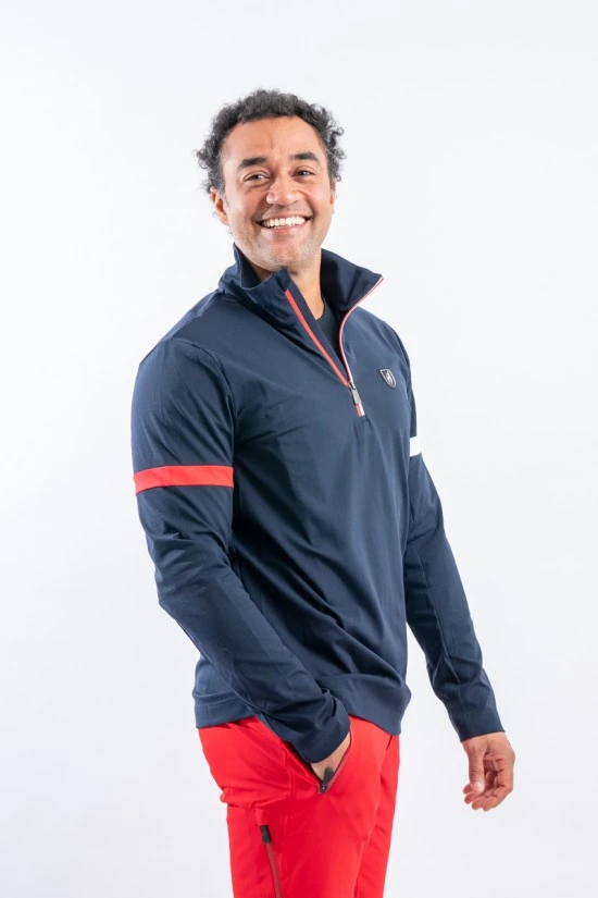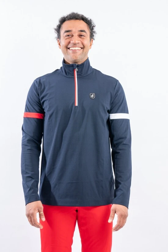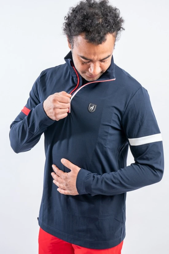Sottotuta mezza zip Dan firmato Toni Sailer. Realizzato in tessuto tecnico elasticizzato felpato. Caratterizzato dalla fascia bicolore sulla schiena. Confortevole, caldo e traspirante è ideale in ogni occasione e condizione.