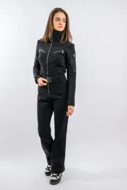 Tuta intera in tessuto felpato 4-way stretch con fascia elasticizzata lungo il fianco che si prolunga fino al fondo. Importante cintura in vita con fibia loggata. Impreziosita dalle zip gioiello sul davanti e sulle tasche posteriori. Logo istituzionale cucito sulla manica. Must have per l’inverno 2020-21.