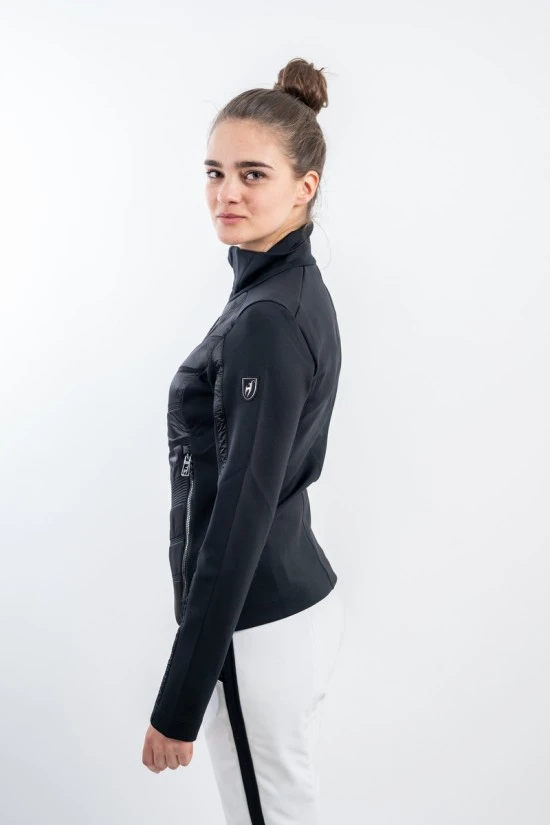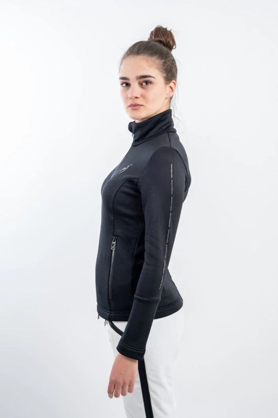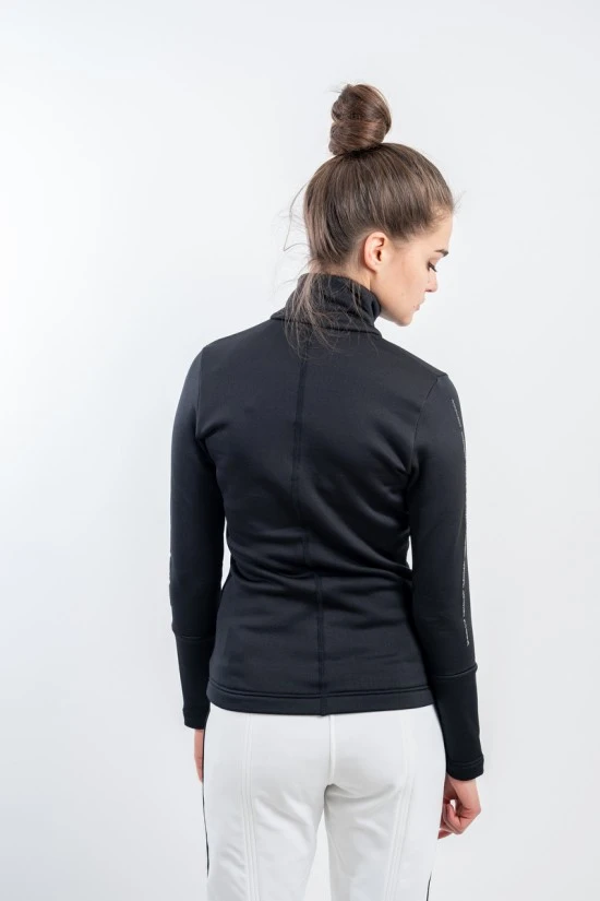 Sottotuta full zip in tessuto elasticizzato. Arricchito da strisce in lourex lungo le maniche per un effetto chic. Zip gioiello doppio cursore. Logo istituzionale in cristalli Swarowski applicato sul petto. Ideale da indossare da solo o come strato isolante aggiuntivo sotto la giacca.